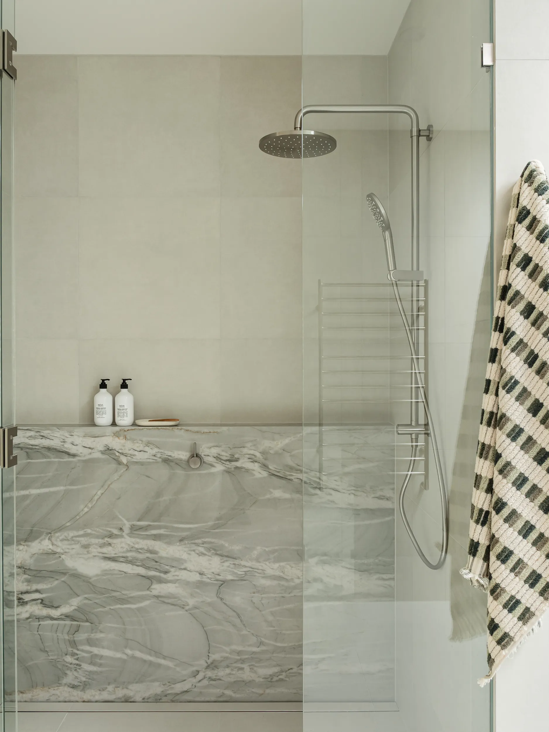 The final design features a calming colour palette, soft curved forms and warm timber finishes, creating a refined and cohesive contemporary living space.