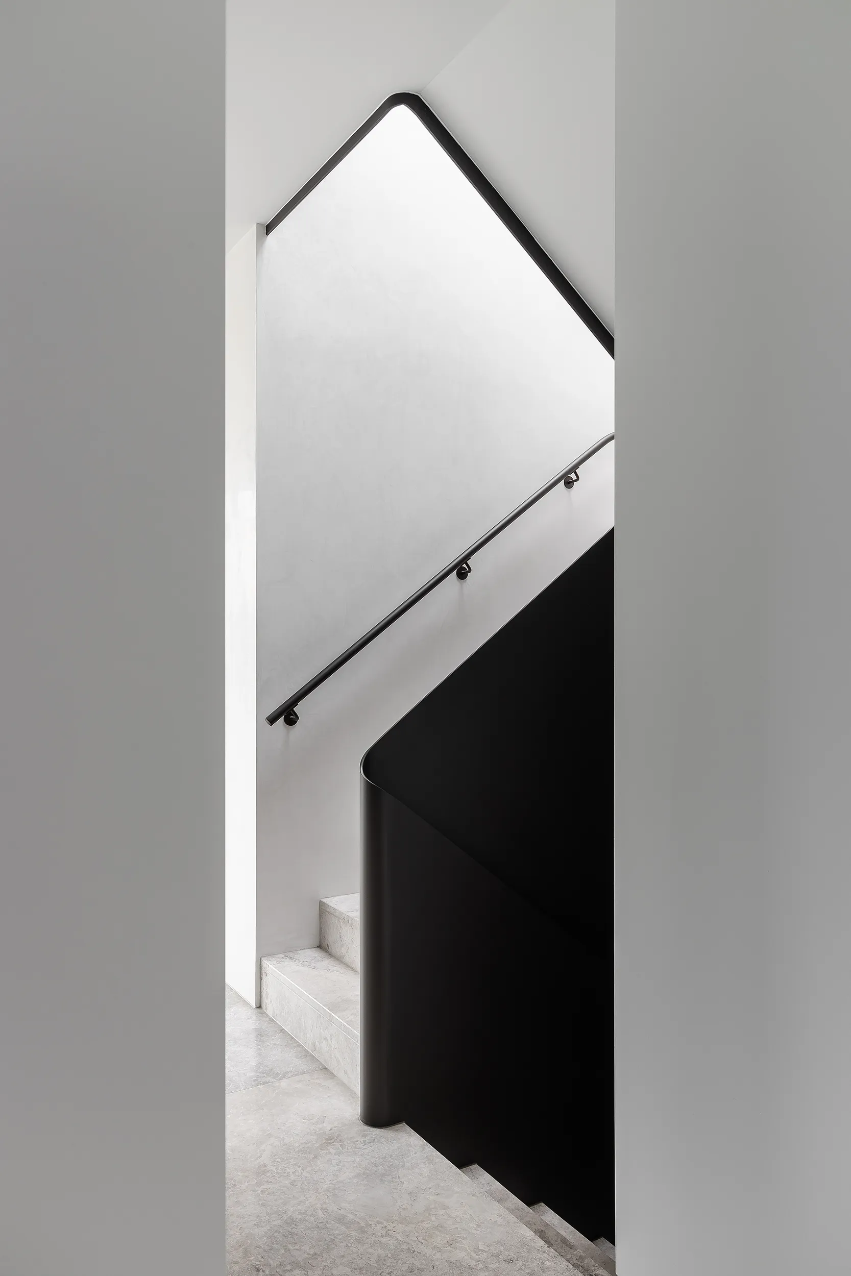 The use of light is a defining feature of the House of Bronzed Steel and Stone. In addition to the oculus over the stair void, three north facing light scoop devices that replicate the gabled roof form of the street frontage, bring natural light into the more private spaces of the home on the first floor. The vista over the dining area adjacent swimming pool allows light to flow through the living room, and an east-facing glass kitchen splashback allows light to filter through a green bamboo screening.
