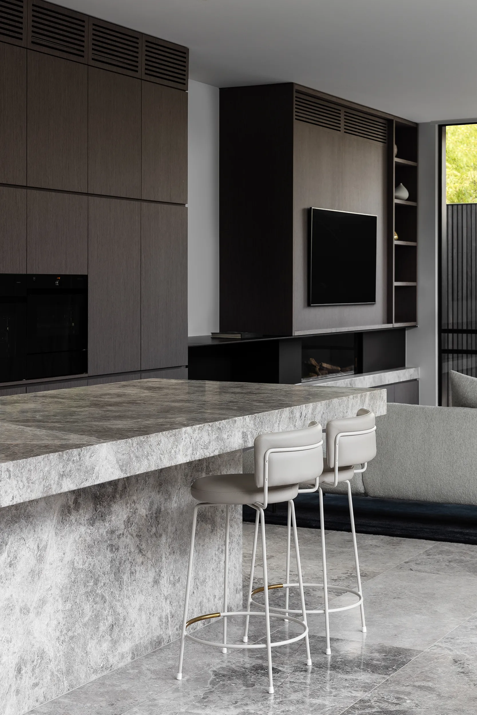 At the rear of the home sits the living area, a considered blend of timber veneered joinery and highly refined architectural glazing that relate to each other through horizontal datums that relate to the height of the swimming pool, door hardware and benchtop heights.