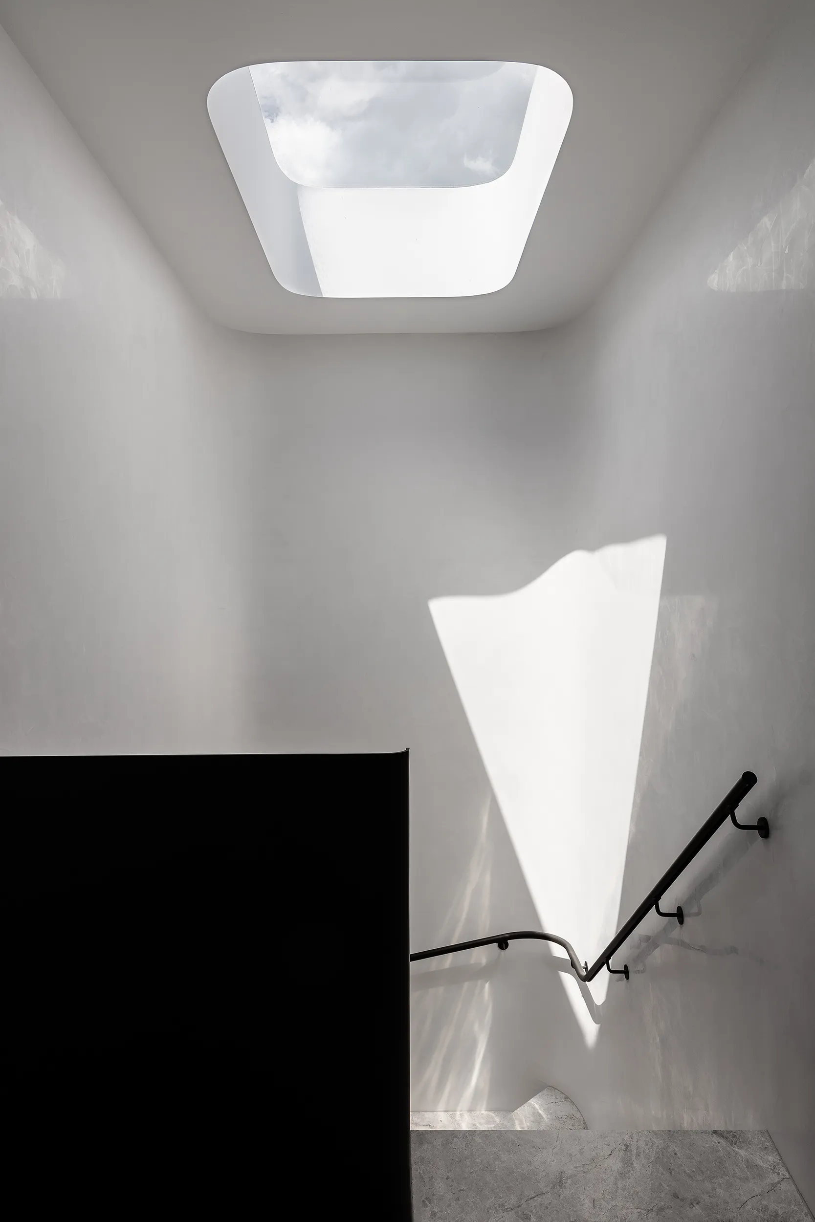 Once inside, you’re greeted by a curved steel and stone stair that rises from the basement up three stories and commands attention as the centrepiece of the home. The stair is illuminated by an oculus on the top that allows natural light to flood in, reflecting off the venetian plaster walls and adding to the sense of spaciousness and lightness. The venetian plaster walls are a work of art themselves, with their smooth finish and subtle variations in colour adding depth and character to the space.
