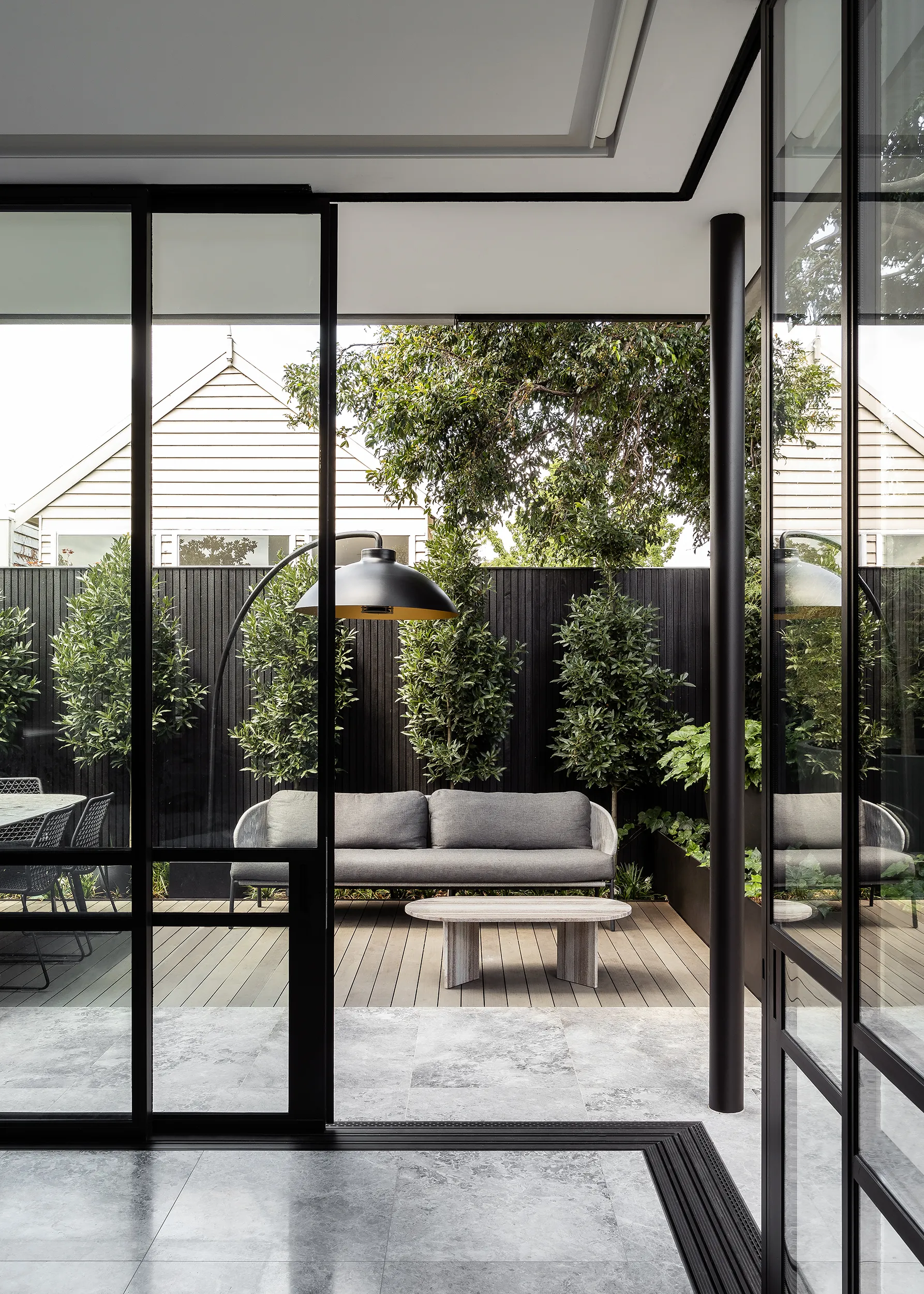 Full height bronzed steel sliding doors retract, allowing the rear of the home to fully open up allowing the outdoor garden to behave as a seamless extension of the indoor living area. The decision to use the same stone flooring both inside and out was an intentional strategy employed to borrow the landscaping in a way that makes the living area feel larger than it actually is.