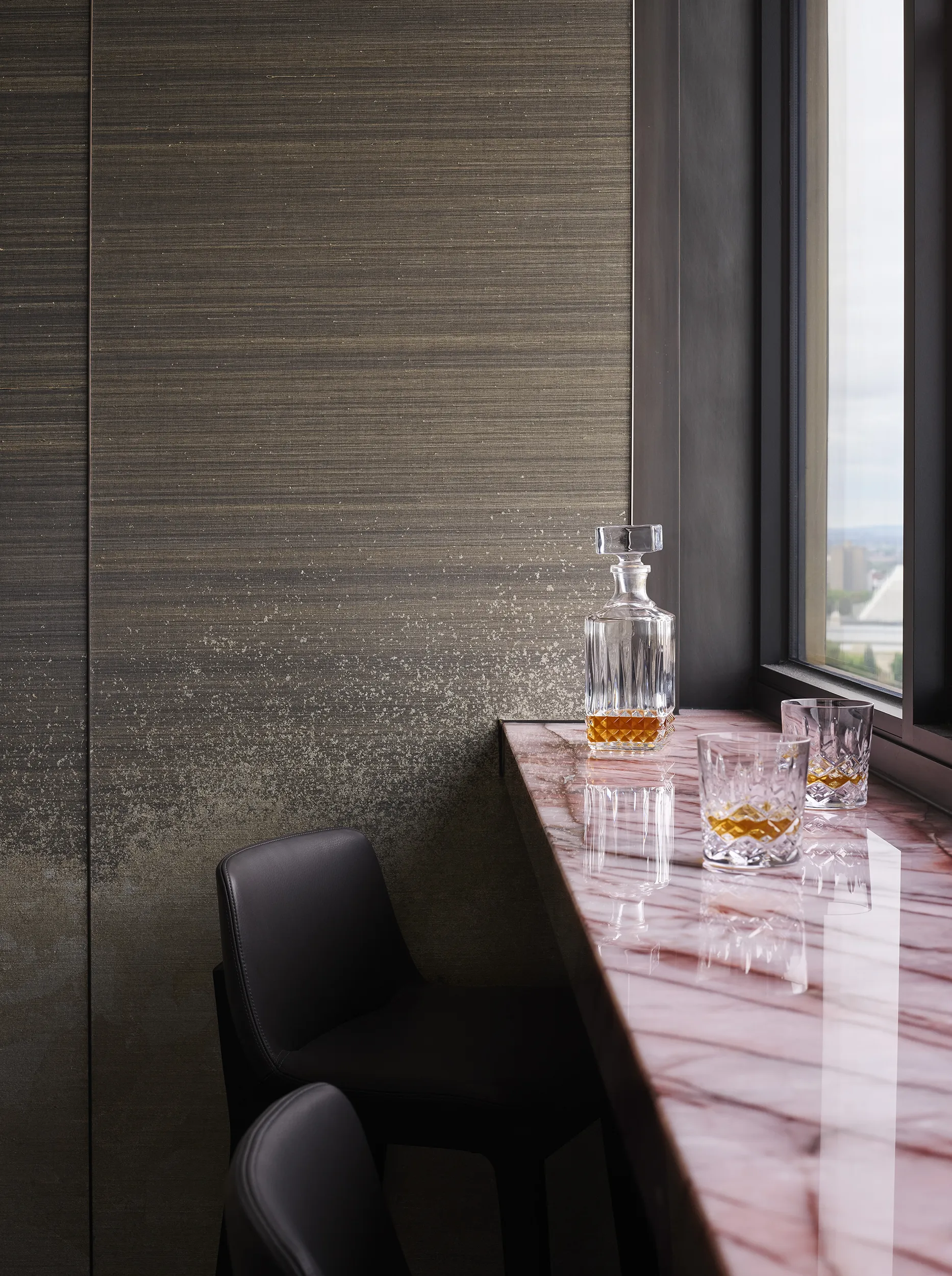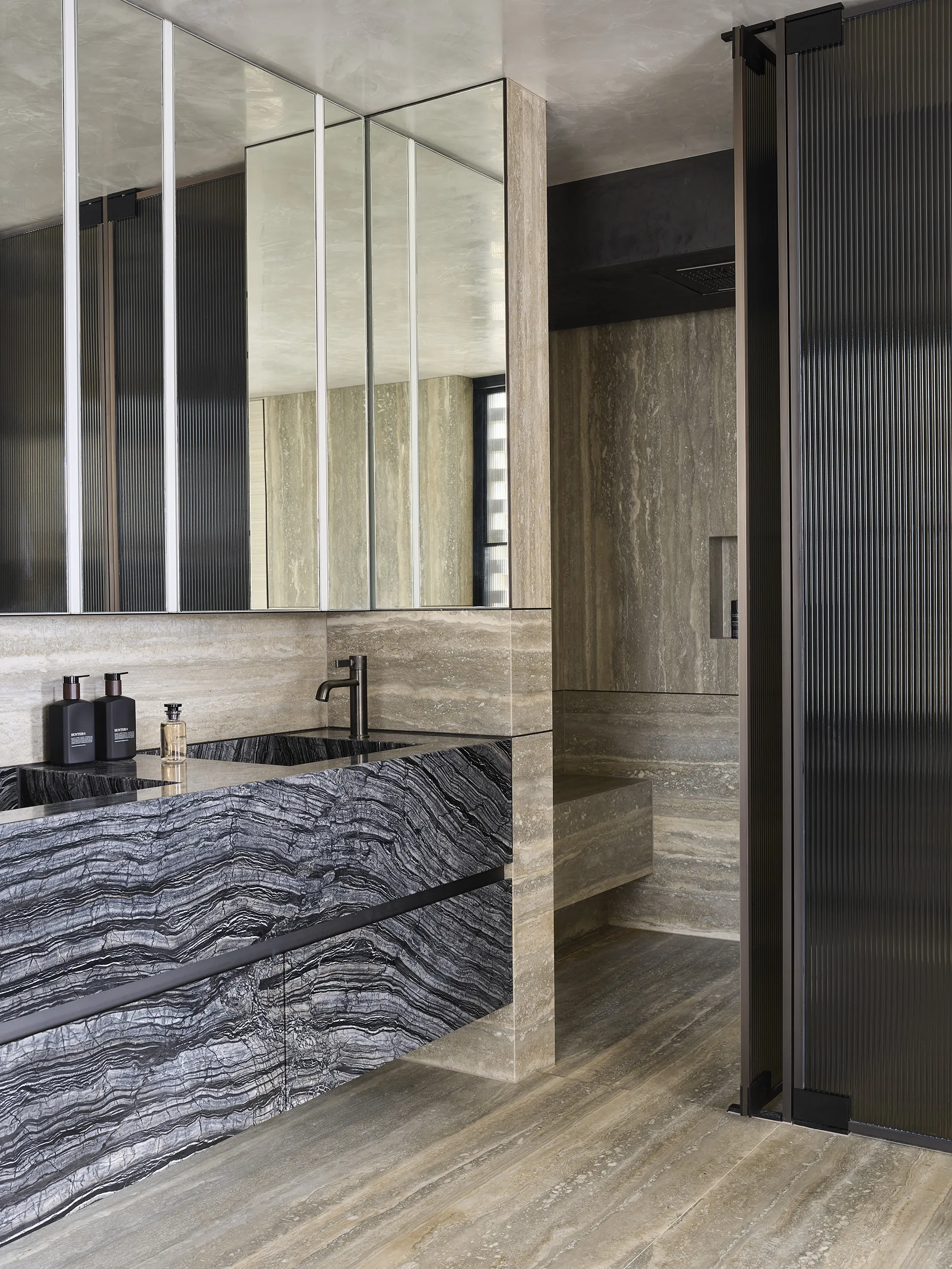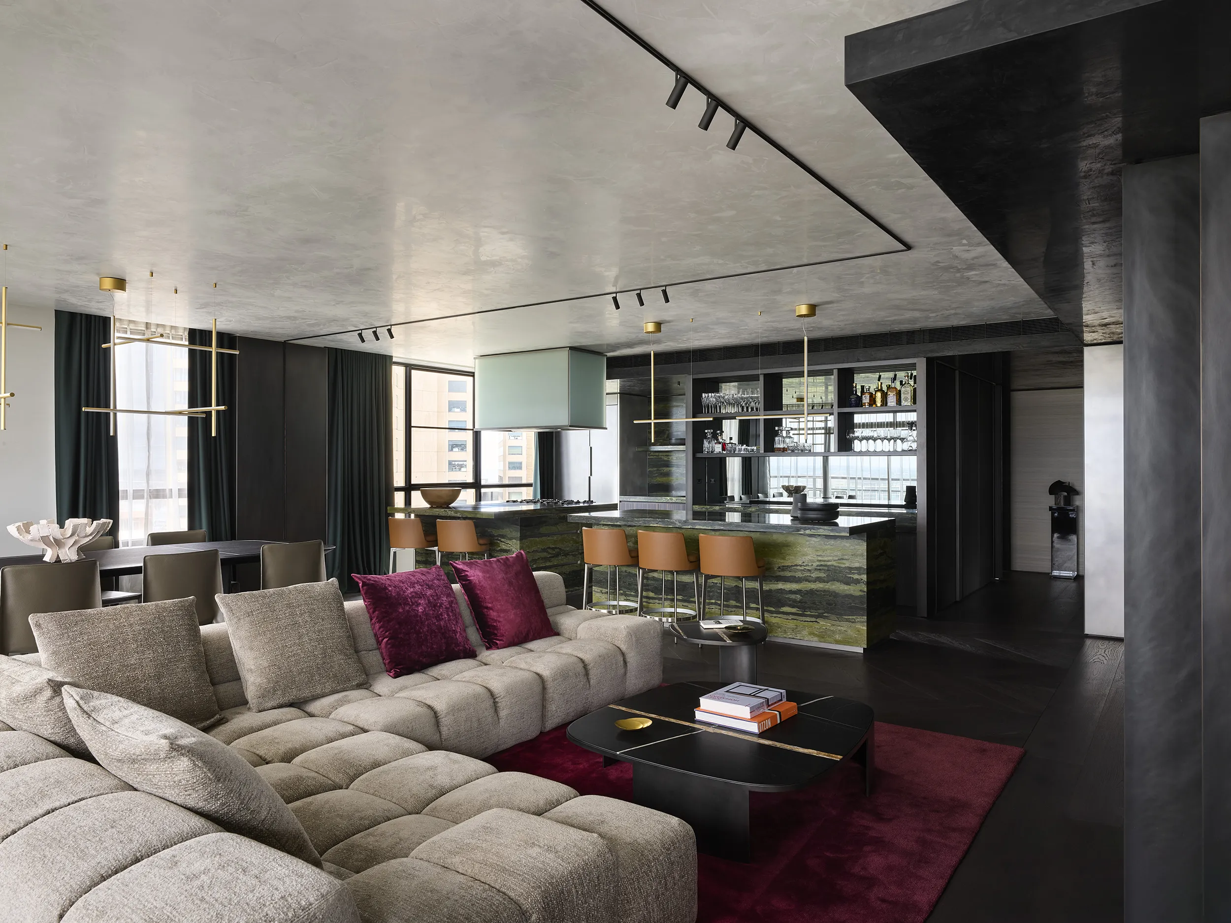 Inspired by Milanese style, the design features raised polished-plaster ceilings, an open plan living and dining area, and a reimagined entry lined in striking black and white marble. Rich finishes including horsehair wallpaper, satin metal details, and unique natural stone add depth and texture throughout.