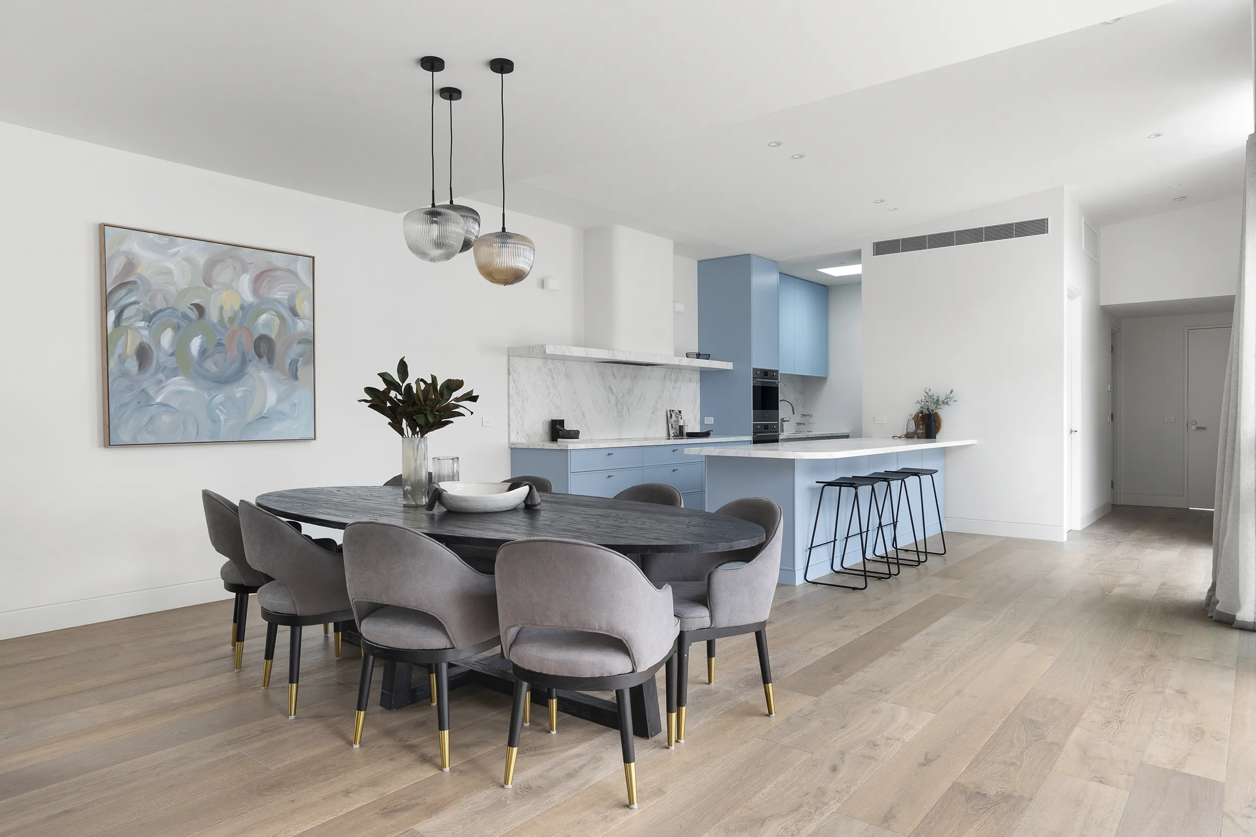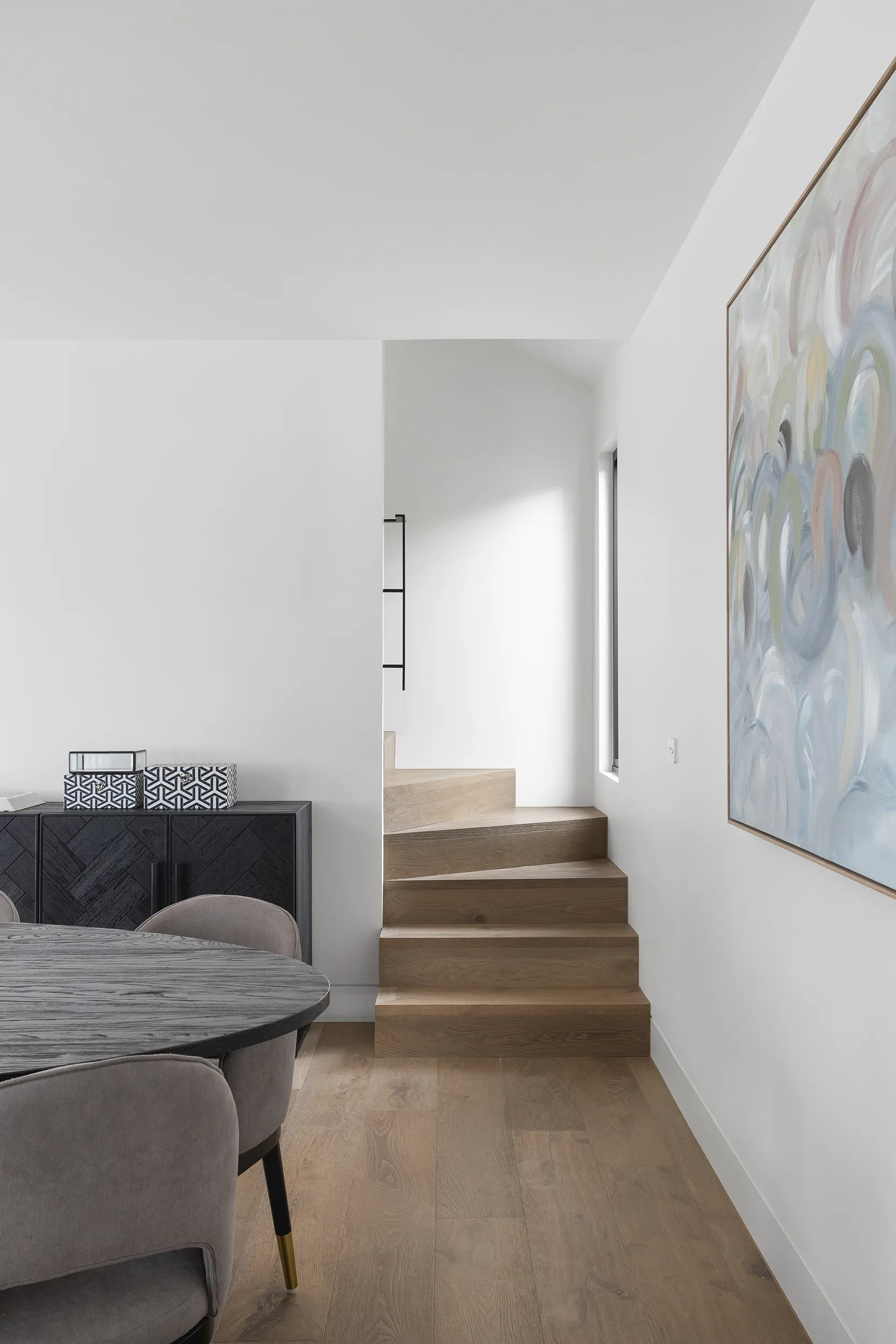 Inside, engineered timber floors and Italian tiles form a warm, durable foundation. Curved walls guide movement through the home, drawing attention to key features like the fireplace and custom rangehood. Linen drapes soften the spaces, adding texture and a relaxed elegance.